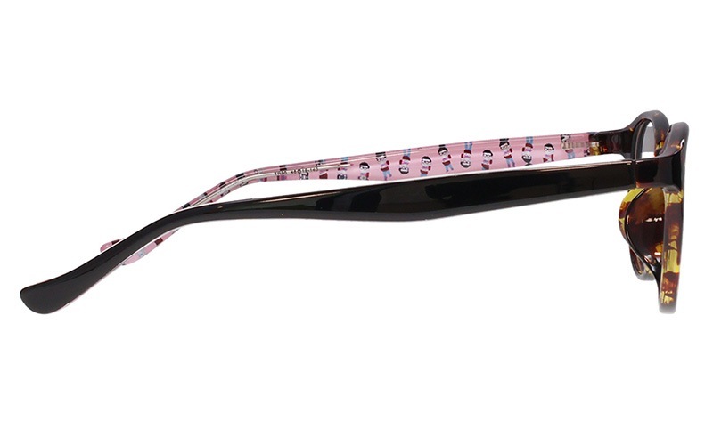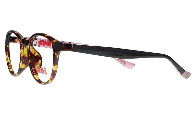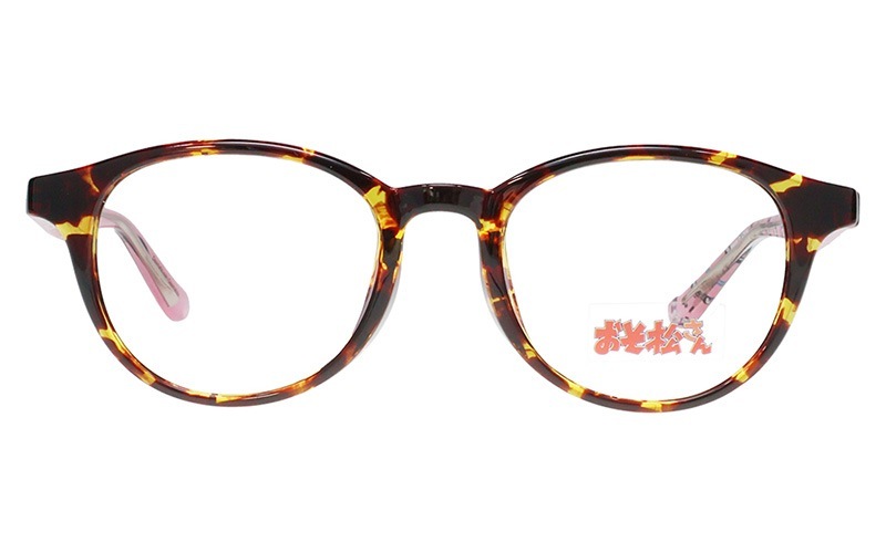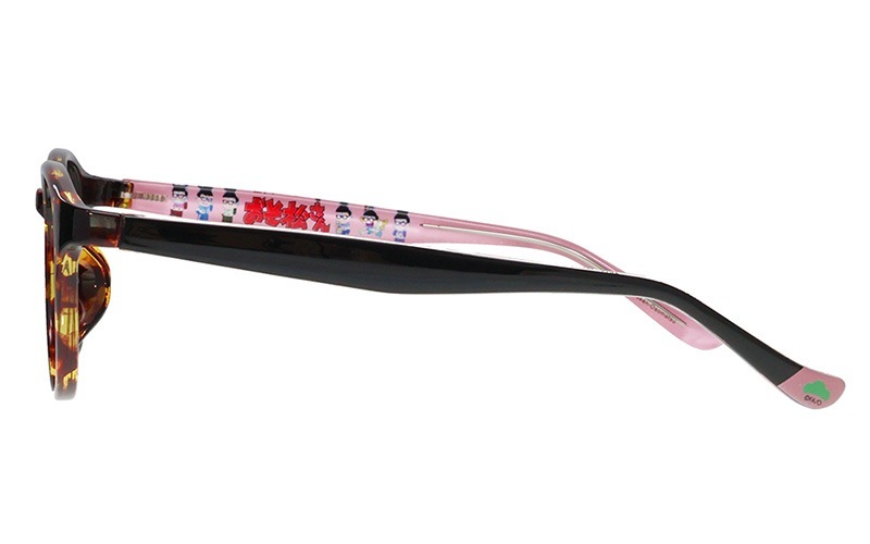 おそ松モデルはデミブラウン×ピンクカラーのラウンドフレーム。テンプル内側にはかわいい描きおろしイラストを散りばめました。左先セルに入った松マークがアクセント!「おそ松さん」特集ページはこちら→https://shop.meganeflower.co.jp/view/category/osomatsu