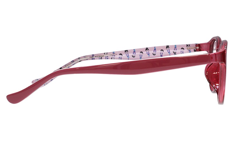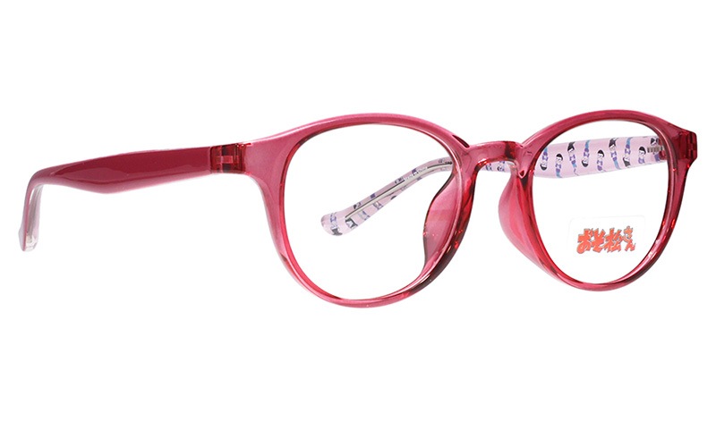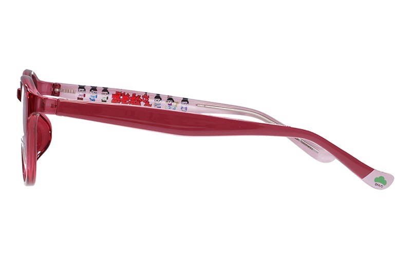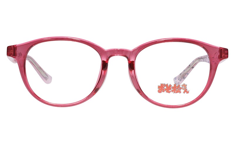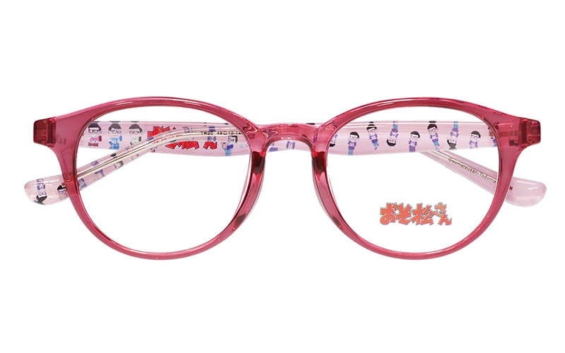 トド松モデルはクリアピンク×ピンクのラウンドフレーム。テンプル内側にはかわいい描きおろしイラストを散りばめました。左先セルに入った松マークがアクセント!「おそ松さん」特集ページはこちら→https://shop.meganeflower.co.jp/view/category/osomatsu