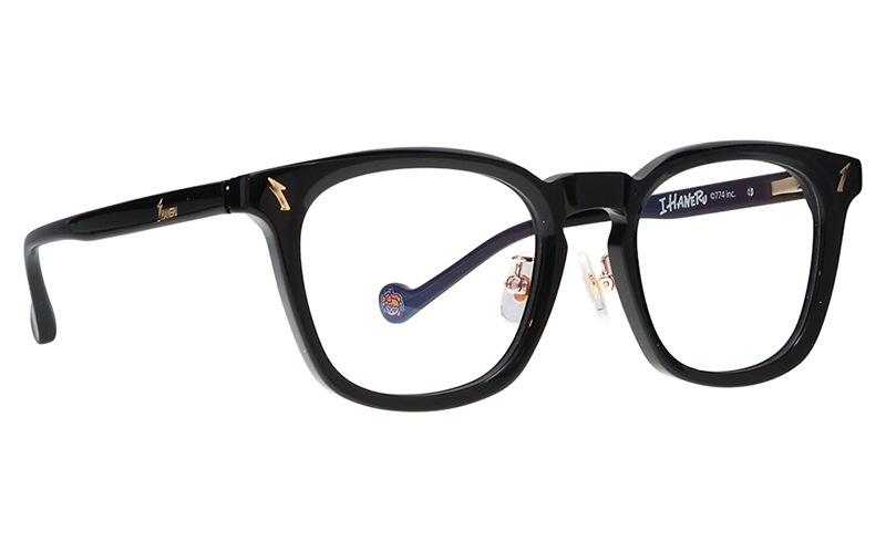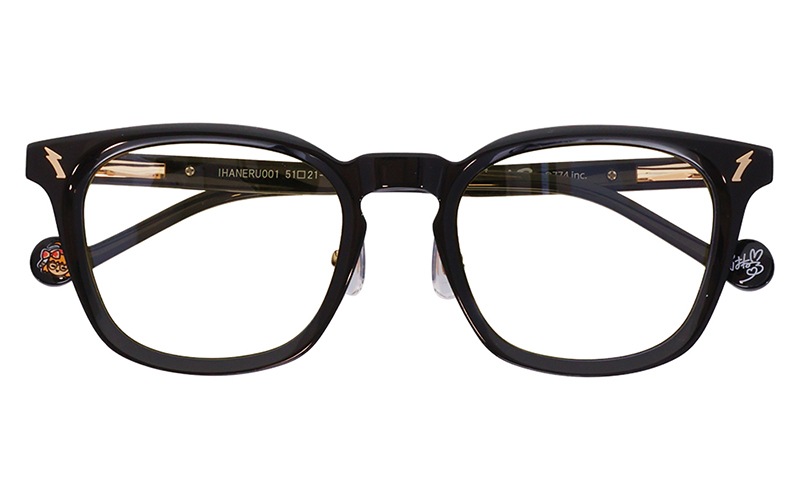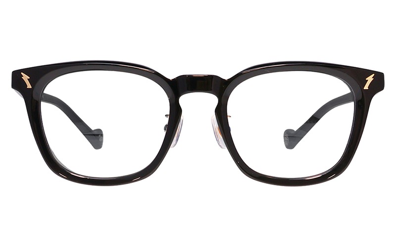 万能カラーで日常使いしやすいブラックウェリントンフレーム。目元とテンプルに、強烈な個性を引き立たせる稲妻柄の鋲入り。バチ先には本人描き下ろしの自画像イラスト+サイン入り。板バネでテンプルが外側に開く構造で、かけ心地も抜群です。標準で度なしブルーライトカットレンズが入っております。